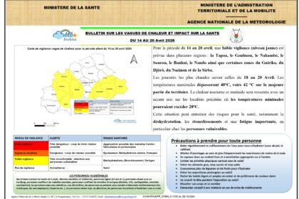 Les journées les plus chaudes sur le territoire burkinabè seront celles du 18 au 20 Avril. Les températures maximales dépasseront 40°C, voire 42 °C sur la majeure partie du territoire. La chaleur noct...