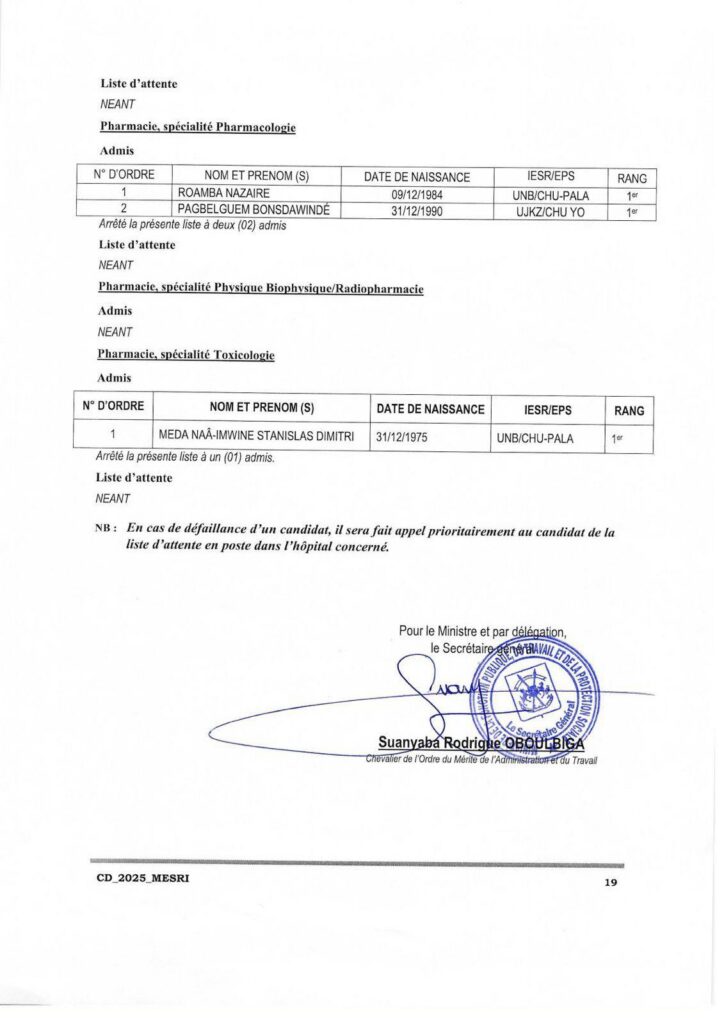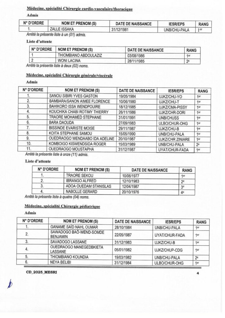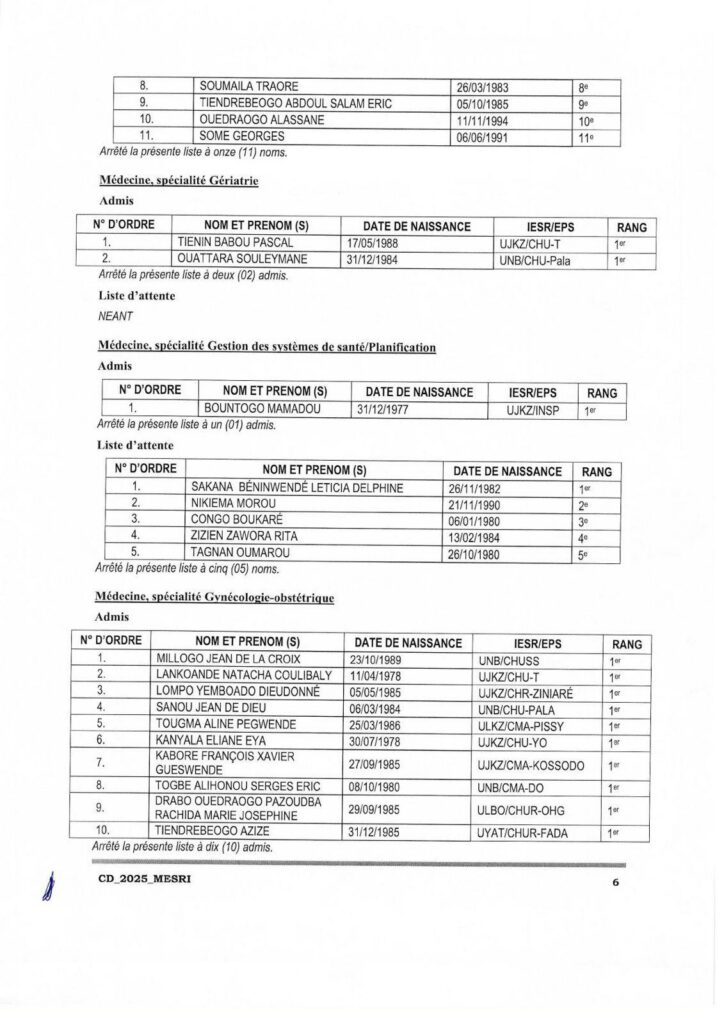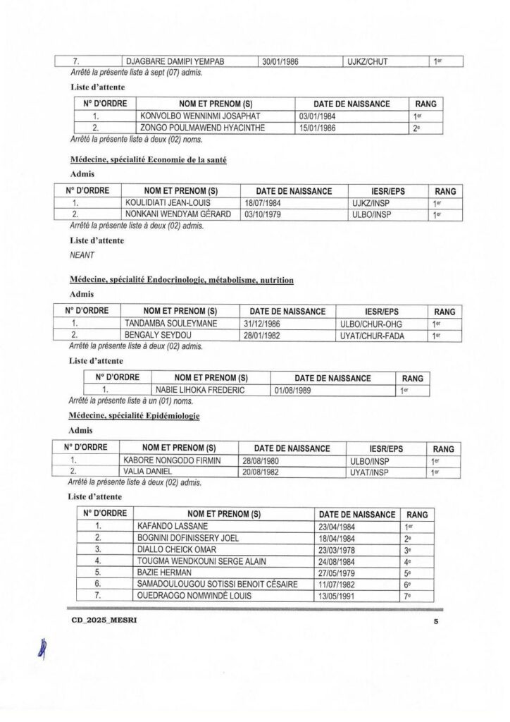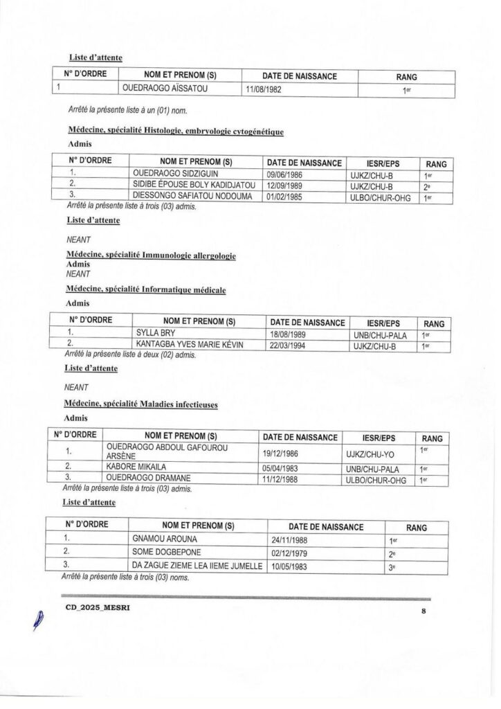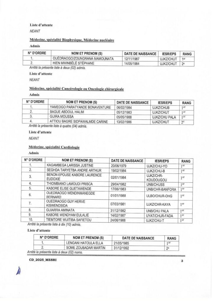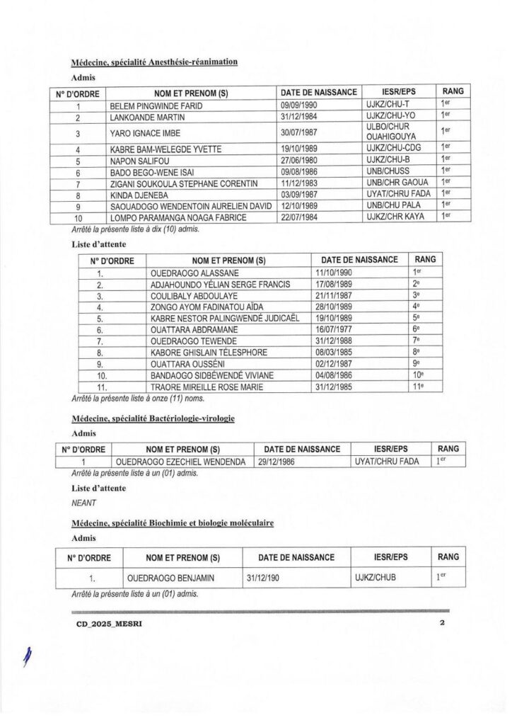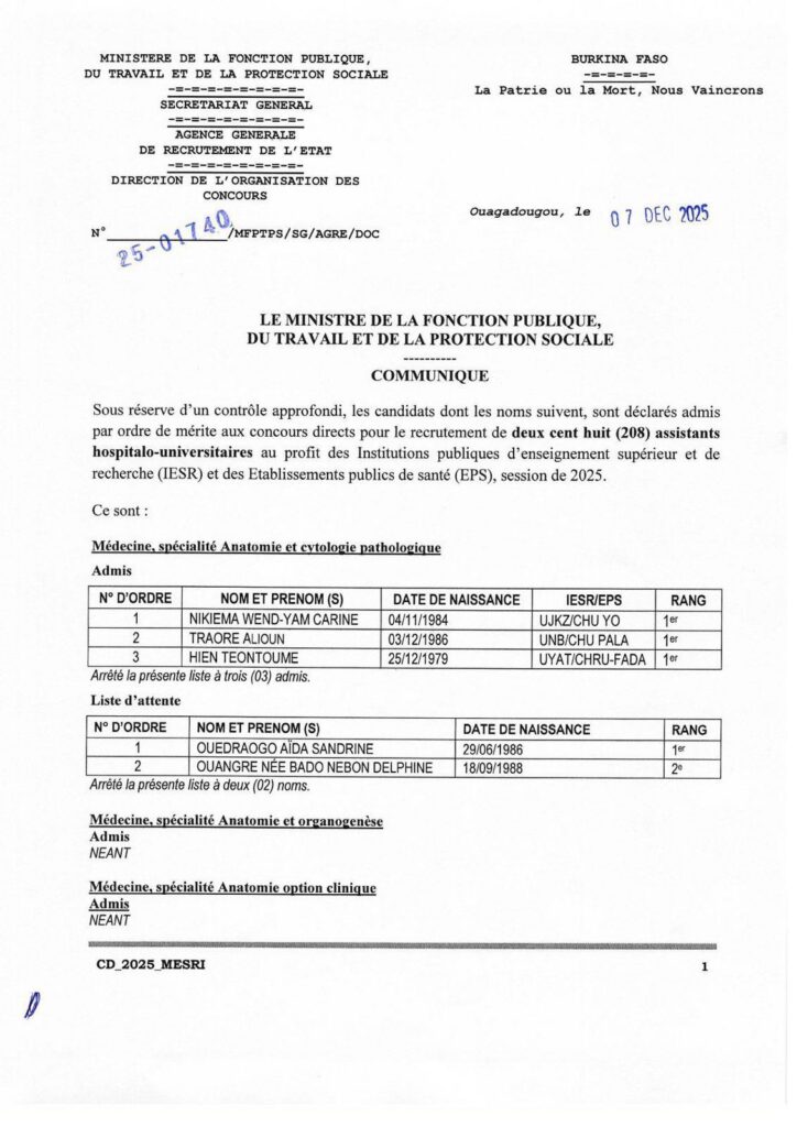 Communiqué relatif aux résultats d’admission aux concours direct de recrutement de 208 assistants hospitalo universitaires au profit des Institutions publiques d’enseignement supérieur et de recherche (IESR) et des Etablissements publics de santé (EPS), session 2025. Tous les admis sont convoqués pour une rencontre le lundi 8 décembre 2025 à 14h00 dans l’amphi B de l’Université Joseph KI-Zerbo. Cette rencontre marquera le début de leurs activités de formation et d’encadrement des étudiants.