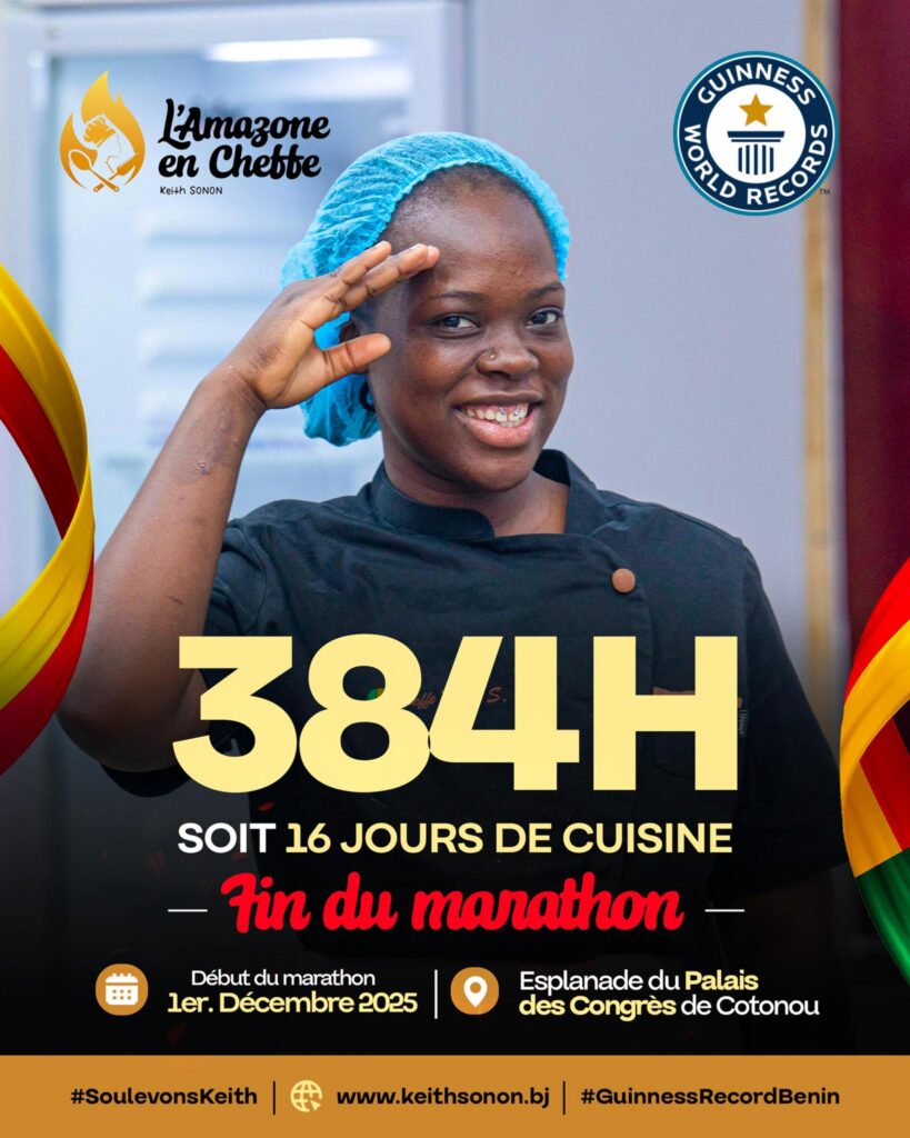 Le mercredi 17 décembre 2025, la Cheffe Keith Sonon a officiellement bouclé 384 heures de cuisine continue, mettant fin à son marathon culinaire pour le Guinness World Records (en attente d’homologation). Au-delà des chiffres, cette aventure aura rassemblé un peuple, mobilisé une nation et montré au monde la force, la solidarité et le savoir-faire béninois. C’est à juste titre que le chef de l’Etat, le président Patrice Talon est allé en personne féliciter l’amazone au palais des congrès de Cotonou.