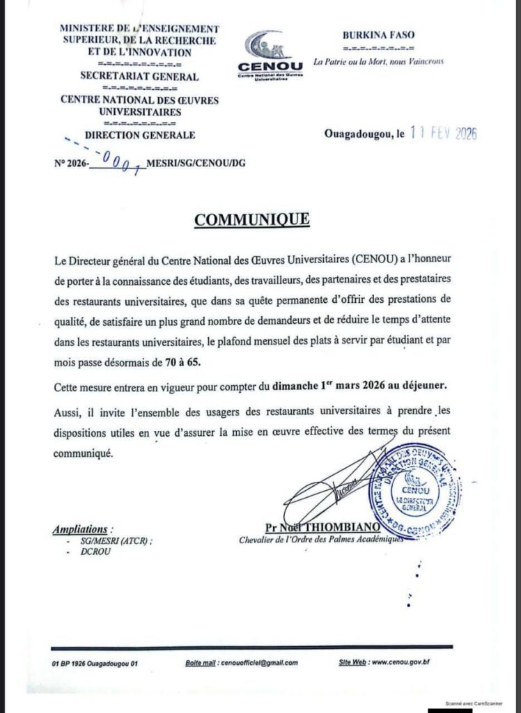 Le Centre National des Œuvres Universitaires réduit le plafond mensuel de repas autorisés par étudiant. C’est du moins ce qui ressort de ce communiqué en date du 11 février 2026. Le nombre maximum de plats qu’un étudiant peut consommer par mois passe de 70 à 65 et la mesure entrera en vigueur à compter du 1er mars 2026, dès le déjeuner.