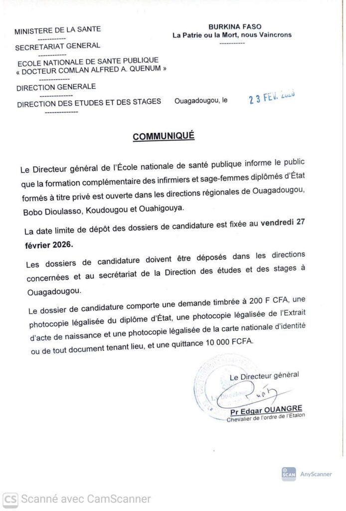 Le Directeur général de L’Ecole Nationale de Santé Publique (ENSP), informe le public de l’ouverture de la formation complémentaire des filières infirmiers et sage-femme diplômés d’État à titre privé dans les directions régionales de L’ENSP de Bobo-Dioulasso, Koudougou, Ouagadougou et Ouahigouya. La date limite des inscriptions est prévue pour le 𝗩𝗲𝗻𝗱𝗿𝗲𝗱𝗶 𝟮𝟳 𝗳𝗲́𝘃𝗿𝗶𝗲𝗿𝟮𝟬𝟮𝟲 dans les directions concernées et au secrétariat de la direction des études et des stages à Ouagadougou.
