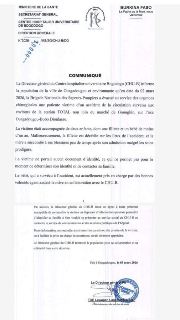 Dans ce communiqué, la direction du VHU Bogodogo lance un appel à toute personne pouvant aider à reconnaitre une mère (victime) d’un accident de la circulation survenu aux environs de la station Total non loin du marché de Goughin le 2 mars 2026 sur l’axe Ouagadougou-Bobo-Dioulasso.