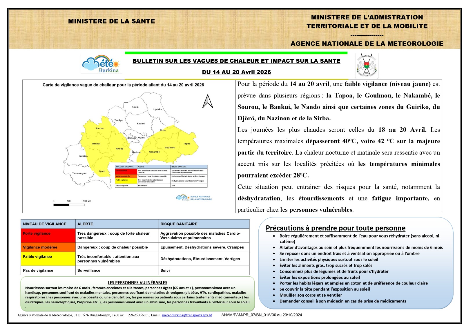 Pour la période du 14 au 20 avril, une faible vigilance (niveau jaune) est prévue dans plusieurs régions : la Tapoa, le Goulmou, le Nakambé, le Sourou, le Bankui, le Nando ainsi que certaines zones du Guiriko, du Djôrô, du Nazinon et de la Sirba.